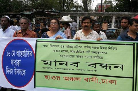 তিস্তা ও টিপাইমুখের সমস্যার চেয়েও পুরনো কিন্তু ক্রমশ তিব্র থেকে তিব্রতর হচ্ছে যে সমস্যা তার নাম ফারাক্কা বাঁধ সমস্যা। ফারাক্কা বাঁধের মাধ্যমে ভারতের নিয়মিত পানি প্রত্যাহারের কারণে বাংলাদেশের এককালের প্রমত্তা পদ্মা বর্তমানে মরাগাঙে পরিণত হয়েছে। বিভিন্ন চুক্তি ও চুক্তিহীনতার মাধ্যমে বাংলাদেশ যে পরিমান পানি বর্তমানে পাচ্ছে তাতে শুধু যে পদ্মা একটি মৃত নদিতে পরিণত হয়েছে তাই নয় পদ্মার উপর নির্ভরশিল অপরাপর নদিও মরতে শুরু করেছে। নদি মরলে কৃষি, সেচ, মৎস্য সম্পদ, নৌপথ ইত্যাদির ক্ষতিসহ ভ‚-গর্ভস্থ পানির স্তর নিচে নেমে যাওয়া, প্রকৃতি, পরিবেশ ও জৈব-বৈচিত্র্যের যে ক্ষয়ক্ষতি সাধারণভাবে হয়, তা বাংলাদেশেও হয়েছে এবং হচ্ছে কিন্তু বাংলাদেশ ভাটির দেশ হওয়ার কারণে এর সাথে বিশেষভাবে যুক্ত হয়েছে উপক‚লের লবণাক্ততা। উপক‚লিয় লবণাক্ততার কারণে বিশ্বের সর্ববৃহৎ ম্যানগ্রোভ ফরেস্ট সুন্দরবন আজ মারাত্মক হুমকির মুখে। এই লবণাক্ততা থেকে বাংলাদেশের উপক‚লিয় এলাকা রক্ষা করার জন্য আমাদের নদিসমূহকে শুধুমাত্র ন্যূনতম প্রবাহ দিয়ে বাঁচিয়ে রাখলেই চলবে না, প্রয়োজন স্রোতস্বতি নদি। সমুদ্রের জোয়ার-ভাটার কারণে উপক‚লে যে লবণ পানি প্রতিনিয়ত প্রবেশ করে নদি তার স্রোতের মাধ্যমে তা নিয়ন্ত্রণ করে প্রতিবেশের ভারসাম্য বজায় রাখে। জলবায়ু পরিবর্তনের ফলে বিশ্ব তাপমাত্রা বৃদ্ধির কারণে সমুদ্রপৃষ্ঠের উচ্চতা ক্রমাগত বেড়ে চলেছে সেক্ষেত্রে স্রোতস্বতি নদির প্রয়োজনও উত্তরোত্তর বেড়েই চলেছে।
